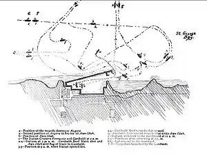 The two Italian cruisers approached the harbour and fired a blank shot at the Ottoman vessels lying there.[1] Upon sighting the Italian ships, the Ottoman commander on Avnillah sent out a launch under a flag of truce to communicate with the enemy. While negotiating, the Ottoman commander ordered Angora to position itself near the harbour's mole. At 07:30, Admiral Revel ordered the Ottoman launch to return with an ultimatum addressed to the Wāli of Beirut informing him to surrender his two warships by 09:00.[6] The message was received by the Wali at 08:30. The Wali was in the process of issuing an order of surrender but this was not received by the Italians by the deadline. Accordingly, at 09:00, the Italians began their attack on the Ottoman ships in the harbor.[7]