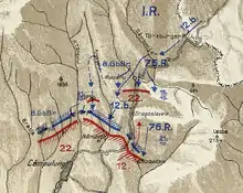 The Central Powers forces in the area were represented by Curt von Morgen's I Reserve Corps, a mixed combat group with German and Austro-Hungarian units.[1] The Romanian forces consisted in elements of the Romanian 1st Army, namely the 12th and 22nd Divisions. The 12th Division had been part of the 1st Army since the beginning of the campaign, while the 22nd Division had only recently been assigned to the 1st Army. The 1st Army was at that time commanded by General Nicolae Petala, who had replaced General Ioan Dragalina on 25 October, after the latter was wounded in action.[2] Von Morgen had succeeded in clearing the Bran/Törzburg Pass by 12 October. However, there was a second ridge to the south of Câmpulung, meaning that the road into Wallachia would be open only when the town and the heights beyond it had been captured.[3]