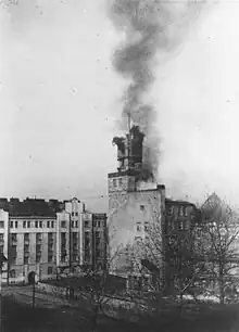 On the next morning the Germans attacked the Red Guard headquarters at the Smolna building in Kaartinkaupunki area. The 400–500 Reds of the Smolna finally capitulated at 7 AM. The last fighting Reds were now at the northern worker districts of Kallio and Hakaniemi, where heavy artillery fire was aimed. Among other buildings, the Workers' House was hit and damaged severely. Finally at 2 PM, a white flag was raised on the tower of the Kallio Church and the battle was over.[6]