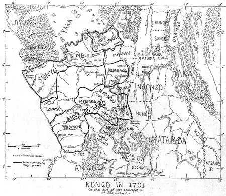 In 1665 the Kingdom of Kongo clashed with their one-time allies the Portuguese at the Battle of Mbwila.[1] The engagement resulted in a crushing Portuguese victory ending in the death of the Mwenekongo António I and most of the kingdom's nobility. Afterwards, Kongo erupted in a brutal civil war between the House of Kinlaza, which had ruled under the dead king, and the House of Kimpanzu.[2]