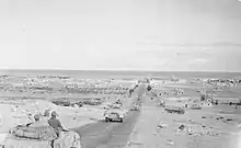 Mersa Matruh (Mersa, anchorage) was a small port 120 mi (190 km) east of the wire, halfway between Cyrenica and El Alamein. A railhead connected the town to Alexandria. The harbour was 1.5 mi (2.4 km) long and enclosed a small, deep-water anchorage. The coastal town was like a small Tobruk.[18] Mersa Matruh had been fortified in 1940 before the Italian invasion of Egypt in 1940 and was further strengthened during the build-up for Operation Crusader and was the last coastal fortress in Allied possession.[19][20] The town is on a thin coastal plain that extends inland 10 mi (16 km) to an escarpment. Extending further south is a second narrow plain extending 12 mi (19 km) to the Sidi Hamaza escarpment.[12] At the eastern end of this escarpment is the Minqar Qaim track. Beyond the upper escarpment lies the high desert, extending 80 mi (130 km) south to the Qattara Depression.[12] The western approach to the town was mined and these minefields had been extended around the southern approach to the town but the eastern approach to the fortress was still open; an airfield was just inland. The coast road (Via Balbia) was the main avenue of retreat and ran through the town.