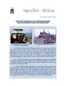 The Indian commander, Arun Bahuguna was awarded the Nao Sena Medal for his role in the engagement.[7] The captured pirates were taken to India for trial where they were charged with kidnapping, kidnapping for ransom, attempted murder, and weapons related offenses.[8] As none of the pirate's former hostages appeared as witnesses, the pirates were acquitted of kidnapping for ransom and sentenced in August 2017 to seven years imprisonment on the remaining charges. The pirates had spent six and a half years in prison prior to their sentencing.[8]