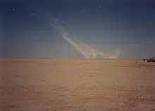 The breach was preceded by a heavy artillery barrage, led by VII Corps artillery units to soften up Iraqi VII Corps defenses.[53] Around 300 guns from multiple nations participated in the barrage. Over 14,000 rounds of artillery and over 4,900 M270 MLRS rockets were fired at Iraqi VII Corps forces during these raids.[4] Iraq lost close to 22 artillery battalions during the initial stages of this barrage.[19] This includes the destruction of approximately 396 Iraqi artillery pieces.[19] By the end of these raids Iraqi artillery assets had all but ceased to exist. One Iraqi unit that was totally destroyed during the preparation was the Iraqi 48th Infantry Division Artillery Group.[54] The group's commander stated his unit lost 83 of its 100 guns to the artillery preparation.[54] These raids were supplemented by air attacks by B-52 Stratofortress bombers and Lockheed AC-130 fixed wing gunships.[55] 1st Infantry Division Apache helicopters and B-52 bombers conducted raids against Iraq's 110th Infantry Brigade.[56] The 1st Engineer Battalion and 9th Engineer Battalion marked and proofed assault lanes under direct and indirect enemy fire to secure a foothold in enemy territory and pass the 1st Infantry Division and the British 1st Armoured Division forward.[20][57] 1st Infantry Division Artillery made a significant contribution to the battle. They would fire 11,752 rounds of the 45,641 rounds fired during all artillery missions during the conflict. 1-5 FA would contribute 5,313 rounds. 4-5 FA contributed 4,100 rounds and 4-3 FA would fire 2,339 rounds during all artillery missions during the Gulf War.[58] These three battalions would be the most active of all 28 of the 155mm battalions present in theatre.[58] On 20 February 1991 4-3 FA along with 2-29 FA, C 1-17 FA(MLRS), A 1-158 FA(MLRS), and A 6-27 FA(MLRS) participated in an artillery raid against multiple Iraqi targets. This raid led to the destruction of multiple Iraqi artillery and armor units along with multiple command posts.[59] On 23 February 1991 4-3 FA along with 1-17 FA, 1-142 FA, 2-142 FA, and 1-27 FA participated in another successful artillery raid. This raid led to the destruction of additional Iraqi artillery assets, maneuver, command, and logistics targets.[59] 1st Infantry Division Artillery and AH-64 Apache attack helicopters conducted operations against the Iraqi 26th Infantry Division.[60] B-52 bombers conducted missions against the Iraqi 48th Infantry Division.[61]