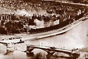 The heaviest urban warfare took place on Wednesday and Thursday in the city center, which was in ruins due to Allied bombing raids over Würzburg.[3] An attempted German counter-attack in the direction of the 3 main bridges failed due to the lack of armament and Würzburg fell to American forces.