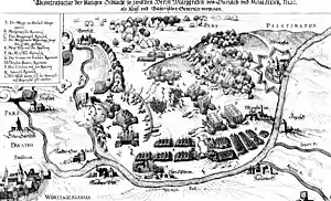 There was a lull in fighting until early afternoon when a Catholic assault on Georg-Friedrich's right flank sent his cavalry into flight. At about six o'clock an enemy cannon shot caused an explosion in the Protestant powder magazine, spreading panic in their ranks. Shortly afterwards, their wagenburg fell to Catholic attacks. Many died trying to escape across the Böllinger Bach creek.[4][5]