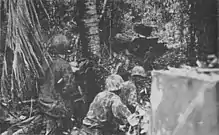 By 12:45, the battalion was 200 yd (180 m) to the rear of Company E, whereupon Smoak learned that Company E was pinned down by heavy fire and was taking casualties, and reinforcement was needed immediately. The Japanese ambush position was located south of the trail junction. Smoak promptly ordered forward Company G—under the command of Captain William McDonough—to reinforce Company E, while Major Edward Clark's Company H was ordered to provide 81 mm mortar support for the attack. Company F—led by Captain Robert Rapp—less the platoon protecting the wire team, was ordered into reserve and to await orders. The artillery forward observer's party was ordered to move forward under the command of Major Glenn Fissel, the battalion executive officer, to assess the situation and call in artillery concentrations to prevent the Japanese from maneuvering.[13]