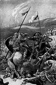 So Bohemond, protected on all sides by the sign of the Cross, charged the Turkish forces, like a lion which has been starving for three or four days, which comes roaring out of its cave thirsting for the blood of cattle ... His attack was so fierce that the points of his banner were flying right over the heads of the Turks. The other troops, seeing Bohemond's banner carried ahead so honourably, stopped the retreat at once, and all our men in a body charged the Turks, who were amazed and took flight. Our men pursued them and massacred them.[5]