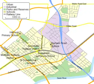 Bayswater consists predominantly of low-density single-family detached homes, zoned as "urban" in the Metropolitan Region Scheme. There is an industrial area in the eastern parts of the suburb and a small town centre around King William Street and Whatley Crescent.[43] The Tonkin Highway and the Midland railway line divide the suburb.