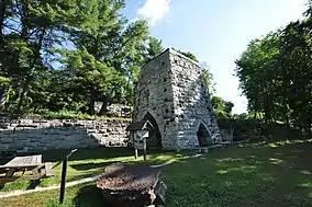 The furnace was built for the production of pig iron by John Adam Beckley in 1847 and continued in operation until 1919.[4] It was the second of three working blast furnaces built at the site; a fourth furnace was under construction in the early years of the 20th century but was never put in operation.[5] The works successfully adapted to changing conditions, but was unable to compete on scale, and closed in the early 1920s.[3] The stack was restored by the state in 1999.[4] The dam built on the Blackberry River to provide power for the furnace and other industrial operations was repaired by the state in 2010.[6]