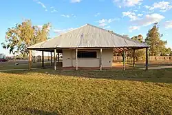 While not widely used across Queensland, the method of pisé construction proved valuable in western Queensland, where building materials were difficult to come by. The limited vegetation provided insufficient material for construction, and while a sandstone quarry existed near Birdsville, allowing residents there to construct stone buildings, Bedourie, surrounded by desert sandhills and stony desert tableland soils, lacked a local stone cache. Pisé construction had several advantages, being "less than one-half the cost of Brick or Wood", "equal in appearance and strength to any stone building", and its material was "always procurable".[58] Pisé had particular benefits in the arid climate of western Queensland: the buildings were not prone to deterioration, and were "cool in summer, warm in winter". A wide array of pisé buildings were constructed in the Channel Country, including Birdsville's first hotel; Windorah's original police station (1884); hotels in Jundah, Windorah, and Canterbury; and homestead buildings at Diamantina Lakes, Cullwilla, Daroo, Palpara, Mornay, St Albans, Toorajumpa, and Monika. St Paul's Anglican Church built in 1874 at Cleveland was also rumoured to be a pisé building, beneath a cement-rendered facade. Most of the pisé buildings did not survive, however. Two of the most renowned, the Windorah hotel and the JC hotel in Canterbury, burned down in 1954 and melted after the roof was removed, respectively.[59][60][61][62][63][64][65][1]