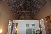 The interior is a single volume, with no ceiling. A part-height timber-framed partition divides the space into two rooms of unequal size. The partition is dressed timber and is clad with ripple iron sheets.[1]