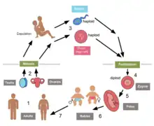 Human reproduction is sexual reproduction that results in human fertilization to produce a human offspring. It typically involves sexual intercourse between a sexually mature human male and female.[1] During sexual intercourse, the interaction between the male and female reproductive systems results in fertilization of the ovum by the sperm to form a zygote.[1] While normal cells contain 46 chromosomes (23 pairs), gamete cells only contain 23 single chromosomes, and it is when these two cells merge into one zygote cell that genetic recombination occurs and the new zygote contains 23 chromosomes from each parent, giving it 46 chromosomes (23 pairs).[2] The zygote then undergoes a defined development process that is known as human embryogenesis, and this starts the typical 9-month gestation period that is followed by childbirth. The fertilization of the ovum may be achieved by artificial insemination methods, which do not involve sexual intercourse.[3] Assisted reproductive technology also exists.