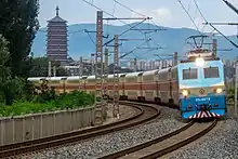 An SS8 locomotive hauling a passenger train at Huaishuling in Fengtai District, Beijing.