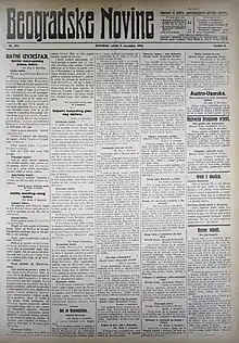 The Belgrader Nachrichten (Serbian: Beogradske Novine, lit. 'Belgrade News'), was the official occupation periodical of the Austro-Hungarian Military Governorate in Serbia during the First World War. As the main propaganda organ, the focus of the newspaper was to portray the occupation and its government as benevolent and working in the interest of the Serb population. It was published daily, in German, Serbo-Croatian and Hungarian from 1915 to 1918, during the occupation of Serbia.[1]