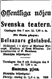Belshazzar's Feast (Swedish: Belsazars gästabud), JS 48, is incidental music by Jean Sibelius to a play of the same name by the journalist, poet and playwright Hjalmar Fredrik Eugen Procopé (1868−1927).