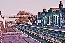The station has two through-platforms linked by a footbridge.[2][3] The footbridge is not wheelchair accessible but there is level access to both platforms from separate streets. There is a small station car park with around twenty spaces.[4] There is a public address system, electronic displays on both platforms and both platforms have a passenger shelter. The station is unstaffed and the former station buildings are now in private use.