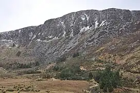 Benleagh's southern flank forms the steep walls and cliffs of the hanging valley of Fraughan Rock Glen, which then falls into the U-shaped valley of Glenmalure below; Benleagh forms a "horseshoe" around the Fraughan Rock Glen with Lugnaquillia at its apex and Cloghernagh 800 metres (2,600 ft), to the south.[7] Benleagh also sits on a broad "spine" that links Lugnaquilla in the south, to Camenabologue and Table Mountain to the north, which circle the Glen of Imaal.[6][8]