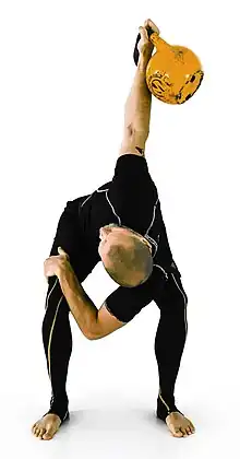 A bent press is a type of weight training exercise wherein a weight is brought from shoulder-level to overhead one-handed using the muscles of the back, legs, and arm. A very large amount of weight can be lifted this way, compared to other types of one-hand press. It has been said that more weight can be lifted with one hand in this manner than in the typical two-handed overhead barbell press. It was a staple of the old-time strongmen and strongwomen such as Eugen Sandow, Arthur Saxon, and Louis Cyr, but is no longer popular. Like any exercise that is attempted without proper progression and full understanding, it poses safety concerns due to the thoracic rotation, and core strength required. However, proponents of the exercise argue that, since it uses the leverage of the body in order to lift the weight, if progressed to and performed correctly, it is a safe exercise. Despite its name, the arm does not press the weight aloft.