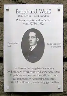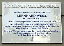 - ↑ 'Gedenktafeln für Bernhard Weiß,' Bezirksamt Charlottenburg-Wilmersdorf,