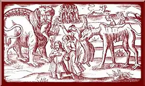 Bicorn and Chichevache are fabulous beasts that appear in European satirical works of the Middle Ages and Renaissance. Bicorn is a creature—part panther, part cow, with a human-like face[1]—that devours kind-hearted and devoted husbands and (because of their abundance) is plump and well fed. Chichevache, on the other hand, devours obedient wives and (because of their scarcity) is thin and starving.
