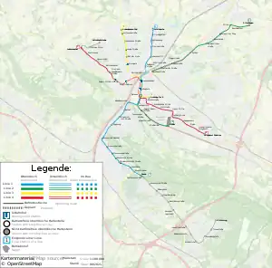 - ↑ "StadtBahn-Netz - Die Linien der StadtBahn und ihre Umgebung" [Stadtbahn Network - The Lines of the Stadtbahn and Its Environs] (in German). moBiel. Archived from the original on 2017-09-27. Retrieved 2013-10-04.