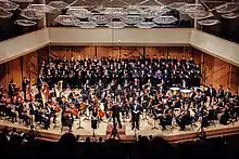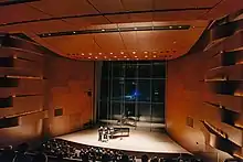 • Mary B. Galvin Recital Hall. This 400-seat hall, with main floor and balcony seating, features a 40-foot glass wall. Walls on each side of the hall are made from undulating wood, covered by African moabi wood, providing optimal acoustics. John van Rein of the Chicago Tribune named Galvin Hall the "most impressive new Chicago concert facility" in 2015.[12]