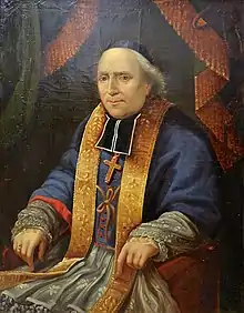 In 1801, he returned to Aix. He was appointed vicar of Brignoles in 1804. On 28 August 1805, he succeeded Irénée-Yves Desolle as the Bishop of Digne, which he remained until his resignation on 31 August 1838[2] at the age of 85 due to his health, becoming Bishop Emeritus of Digne. By then, he had earned the name "Bienvenu" (French for "welcome") due to his charitable nature and evangelical virtues he had shown.[3] He then retired to Aix where he died in 1843, aged 90.[2] He was succeeded by Marie-Dominique-Auguste Sibour. In the diocese of Digne, he is still remembered with much veneration.[1]