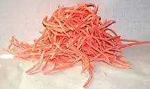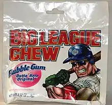 Big League Chew is an American brand of bubble gum that was created by Portland Mavericks left-handed pitcher Rob Nelson and bat boy and future filmmaker Todd Field.[1] It was then pitched to the Wrigley Company (longtime owners of the Chicago Cubs) by fellow Maverick and former New York Yankee All-Star Jim Bouton as a healthy imitation of the tobacco-chewing habit common among ballplayers in the 1970s. Big League Chew was introduced in May 1980, in the traditional pink color already seen in established brands of bubble gum. The cartoon-style packaging, originally designed by artist Bill Mayer, comes in colors such as neon green (sour apple) and bright purple (grape). The original shredded R&D concept samples of the product were produced by running standard sheets of bubble gum through an office paper shredder.