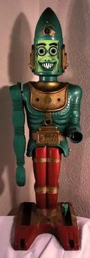 Its key features included a sight scope with cross-hairs, two flashing battery-powered red eyes with an on-off switch, a hand-cranked mechanical voice box that played ten messages, two rubber-tipped darts that were fired from triggers on the back, a left arm that held four red balls which were fired from a spring in the left elbow, and a right arm that had a grasping claw able to pick up objects. One foot was equipped with a spring-powered rocket. It could also squirt water from its navel and was equipped with a compass, whistle, bell, a Morse code clicker with chart, and could bend over at the waist .