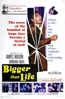 Bigger Than Life is a 1956 American drama film directed by Nicholas Ray and starring James Mason, Barbara Rush, and Walter Matthau. Its plot follows an ailing school teacher and family man whose life spins out of control when he misuses cortisone.[2] It is based on a 1955 article by medical writer Berton Roueché in The New Yorker, titled "Ten Feet Tall".[3] In addition to starring in the film, Mason produced it.