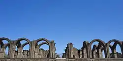 The citadel, built by Yusuf Adil Shah, a mile (2 km) in circuit, is of great strength, well built of the most massive materials, and encompassed by a ditch 100 yards wide, formerly supplied with water, but now nearly filled up with rubbish, so that its original depth cannot be discovered. Within the citadel are the remains of both Hindu temples and old mosques, which prove that Bijapur was an important town. The fort, which was completed by Au Adil Shah in 1566, is surrounded by a wall 6 m. in circumference. This wall is from 30 to 50 ft (10 to 15 m) high, and is strengthened with 96 massive bastions of various designs. In addition there are ten others at the various gateways. The width is about 25 ft (8 m); from bastion to bastion runs a battlemented curtained wall about 10 ft (3 m) high. The whole is surrounded by a deep moat 30 to 40 ft (10 to 12 m) broad. Inside these walls the Bijapur kings bade deference to all comers. Outside the walls are the remains of a vast city, now for the most part in ruins, but the innumerable tombs, mosques, caravanserais and other edifices, which have resisted the havoc of time, afford abundant evidence of the ancient splendour of the place.