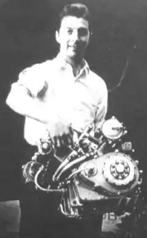 ![]() Lomas demonstrating the light weight of the Moto Guzzi V8 engine | |||||||||||||||||||||||||||||||||