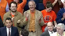 Murray is a fan of several Chicago professional sports teams, especially the Chicago Cubs, Chicago Bears, and the Chicago Bulls.[95] He was once a guest color commentator for a Cubs game during the 1980s.[96] He was in attendance, along with fellow Cubs fans John Cusack, Eddie Vedder, and Bonnie Hunt, during the Cubs' historic Game Seven victory during the 2016 World Series. Murray is an avid Quinnipiac University basketball fan, where his son served as head of basketball operations, and he is a regular fixture at home games. He cheered courtside for the Illinois Fighting Illini's game against the 2004–2005 Arizona Wildcats in the Regional Final game in Chicago. He is a fixture at home games of those teams when in his native Chicago. After traveling to Florida during the Cubs' playoff run to help "inspire" the team (Murray joked with Cubs slugger Aramis Ramírez he was very ill and needed two home runs to give him the hope to live),[97] he was invited to the champagne party in the Cubs' clubhouse when the team clinched the NL Central in late September 2007, along with fellow actors John Cusack, Bernie Mac, James Belushi, and former Cubs player Ron Santo. Murray appears in Santo's documentary, This Old Cub. In 2006, Murray became the sixth recipient of Baseball Reliquary's annual Hilda Award, established in 2001 "to recognize distinguished service to the game by a fan".[98] He sang "Take Me Out to the Ballgame" during a 2016 World Series game at Wrigley Field.[99]