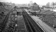 There was a goods yard on the 'down' (eastbound) side of the running lines to the north-west of the station, including a goods shed, cattle pens and a crane. There was a signal box on the 'up' side to the north-west of the station.[1] Goods traffic ceased on 15 June 1967 and the goods shed was demolished soon after.[1] The Shenfield to Southend Victoria line was originally electrified using 1.5 kV DC overhead line electrification (OLE) on 31 December 1956. This was changed to 6.25 kV AC in November 1960 and to 25 kV AC on 25 January 1979.[1]