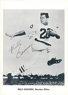 Cannon joined the newly formed Oilers under head coach Lou Rymkus.[58] As one of the highest-paid players in professional football, he was heckled early on by opposing players.[59] Nor did he get along well with Rymkus, whom he described as "unpleasant, confrontational, with a nasty disposition and an oversized ego."[60] In Cannon's rookie year, he led the team in rushing with 644 yards and caught five touchdown passes.[61] His 88-yard touchdown reception from quarterback George Blanda in the 1960 AFL Championship Game helped the Oilers become the inaugural AFL champions. For his efforts, Cannon was named the game's most valuable player.[62]