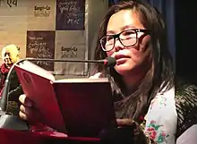 ![]() Tumkhewa at the launch event of her book Hatkelama Prithvi Liyera Ubhiyeko Manche (2019) | |
