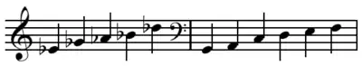 Bimodality is the simultaneous use of two distinct pitch collections. It is more general than bitonality since the "scales" involved need not be traditional scales; if diatonic collections are involved, their pitch centers need not be the familiar major and minor-scale tonics. One example is the opening (mm. 1–14) of Béla Bartók's "Boating" from Mikrokosmos (no. 125, vol. 5). Here, the right hand uses pitches of the pentatonic scale on E♭ and the left hand uses those of the diatonic hexachord on C, perhaps suggesting G dorian or G mixolydian.