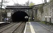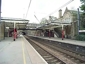 Immediately south of the station is Bingley Tunnel (151 yards (138 m) long)[8] against which a semaphore signal was placed for movements towards Shipley. When the line was electrified in 1994, the semaphore signalling was replaced with colour lights at the same time.[9] The tunnel mouth at Bingley had a painted white patch on it directly behind the semaphore arm, thereby allowing greater recognition for drivers of the signal's position.[10]