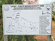 Biodiversity Park, Visakhapatnam, is a botanical garden, an ex situ conservation park, first of its kind in Visakhapatnam, Andhra Pradesh, India.[1] The park is located in the premises of the Rani Chandramani Devi Government Hospital. It extends over 3 acres (1.2 ha). Dolphin Nature Conservation Society (DNCS), Visakhapatnam, a registered, eco-friendly, non-government organization, has maintained it for 13 years and is now maintaining it in collaboration with the hospital and Visakhapatnam Metropolitan Region Development Authority.[2] The park was inaugurated on 5 June 2002.[1] This park has more than 2,000 species of plants.[3] and has recorded visits by 60 species of birds and 105 species of butterflies.[4] The park has become a "living laboratory" for education, awareness and research for students, and botanists, zoologists and researchers.[5][6][7]