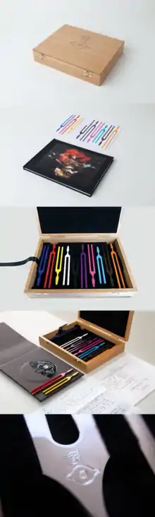 Pre-order for the album started on 19 July 2011.[29] Along with the standard edition album, which would be available in physical and digital formats, three additional editions were announced. The first, the deluxe edition, available in digipak format in its physical form, would contain three additional tracks.[30][31] The second special edition, billed the Manual edition, was announced to include the standard edition of Biophilia and a bonus disc, both contained in a "48-page, full-color, hardbound, cloth-covered, and thread-sewn book, tipped on lenticular panel to the front cover, with foil-blocked spine and back cover".[28] The last edition, called the Ultimate Art Edition, included the Manual Edition of Biophilia in a wooden box, which was filled with 10 chromed tuning forks, each one adjusted to the tone of a Biophilia track, covering a complete octave in a non-conventional scale.[32][33] Differently from the standard and deluxe edition of the album, those two latter editions were available to pre-order until 12 August 2011.[28] Moreover, the Ultimate Art edition was limited to only 200 copies and 75 artist's proofs (a.p.), each one numbered and made to order.[34] She was criticized for the cost of this latter edition, which was £500.[35] Björk unveiled the track listing for Biophilia on 19 August 2011.[31] It was later confirmed that the second disc included in the Manual edition would include a live recording of the Biophilia show in Manchester.[36][37]