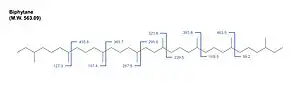 The diagnostic mass spectral fragment ions for biphytane are m/z 197, 259, 267, 323, 383, 393, and 463.[6] Because the cyclic biphytanes yield different mass spectral fragment ions, the modified forms of biphytane present in a sample can be differentiated.[9]