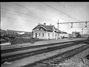 The Swedish Iron Ore Line was extended to the town of Narvik in 1902. Increased traffic made a new station between Katterat Station (then Hundalen Station) and the Swedish border desirable, and the Old Bjørnfjell Station was opened in the fall of 1913. The present Bjørnfjell Station, located further east, was opened in 1925. The old station continued to exist as a stop until 1956.[3] The elevation of the current station is 513.9 metres (1,686 ft).[4]