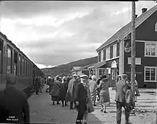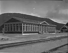 Construction of the station started in 1918 and was finished in 1921. The station, excluding its water tower and restaurant, cost 117,062 Norwegian krone (NOK) to build and took 26,883 man-hours.[1] The station and axillary buildings were designed by Gudmund Hoel of NSB Arkitektkontor.[2] The station opened with the first part of the Rauma Line on 19 November 1921. It remained the terminus until 25 November 1923, when the next section, to Verma Station, opened.[3]