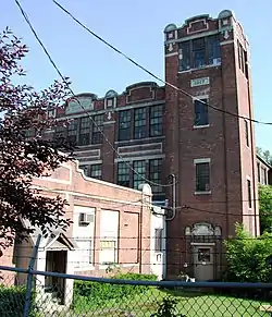 The neighborhood where the historic district is located is around the mills of the Blackinton Company, founded on the north bank of the Hoosic River in 1821 by Sanford Blackinton, Rufus Wells and J.L White.[3] It was one of the three mill villages, with Greylock and Braytonville, that contributed to the westward expansion of North Adams. It would become one of the largest manufacturers of woolen goods in Western Massachusetts, buoyed especially by large orders from the Union Army during the American Civil War.[2] By the early 1900s the neighborhood was a self-contained community, with its own school, jail, stores, post office, library and fire department, and the people there considered themselves be residents of "Blackinton", not North Adams. The community which historically had been disputed between North Adams and Williamstown had a station on the Boston & Maine, as well as bus service to North Adams. The mill closed in 1950.[4]