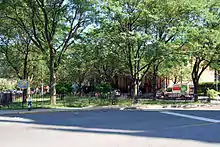 Bleecker Park is a small .37-acre (0.15 ha) urban park in Albany, New York. The park is triangle-shaped, bounded by Madison Place to the south, Madison Avenue to the north, and Eagle Street to the west. The Cathedral of Immaculate Conception is across Eagle Street from the park, while Madison Place, which is only one block-long, consists of rowhouses primarily in High Gothic and Italianate architecture, built in the mid-to-late-19th century.[1] Across from the park on Madison Street is the Empire State Plaza East Parking Garage, built in 1999/2000.[2] The park features the oldest fountain in the city which is surrounded by a small circular garden, two circular beds are also in the park and each feature a shrub surrounded flowers, these small gardens make Bleecker Park "a most charming and restrained Victorian public garden" according to an article in the Albany Times Union.[3]
