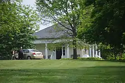 The current historic main house and outbuildings were built by politician and diplomat Andrew Stevenson in 1846. It is a 1+12-story, six-bay, gable-roofed frame building with Gothic Revival and Greek Revival style details. It has an ell at the rear of the west end. The front facade features a pair of one-story tetrastyle porches with pairs of Doric order piers. A notable outbuilding is the square "Athenaeum", a one-story, one-room, frame Greek Revival building with a pyramidal hipped roof and portico supported on Doric piers. Also on the property are a frame kitchen/laundry, a "chapel" or schoolhouse, and two smoke houses. Also on the property are two dwellings, one of which is supposed to have been built to accommodate Justice Roger B. Taney on his visits to Blenheim.[3]