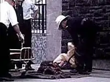 Aftermath of the Oxford Street bomb showing the remains of one of the victims being shovelled into a bag