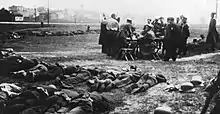 The Bloody Wednesday in Olkusz, German-occupied Poland, 31 July 1940. Polish and Jewish hostages at the forefront, lying face down on the ground. In the background photo shows the table where German police officers are verifying the identity documents. The hostages were forced to remain prone on the ground for several hours, and many were subject to beatings and other abuse.