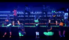 A still from the music video for "Blow" in which Beyoncé is seen dancing a choreography with female dancers. Their style has been noted for referencing 1970s and 80s videos.