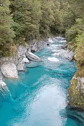 At its confluence with the Makarora River, the aptly named Blue Pools are the destination of a popular[1] short walk from State Highway 6, with a bridge crossing the Blue River and providing good views upstream into the gorge and downstream over the river flowing into Makarora River.[2] The longer Blue Valley tramping track leads deep into the Blue River Valley and along most of the length of the river.